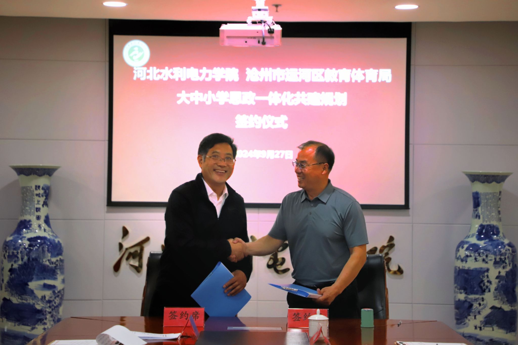 为进一步贯彻落实习近平总书记在全国教育大会上的重要讲话精神,全力推动大中小学思政一体化建设结出硕果,9月27日,我校与沧州市运河区教育体育局举行签约仪式,共同推进大中小学思政课一体化建设。沧州市运河区政府副区长刘晖、我校党委书记张效松出席会议。会议由我校马克思主义学院院长贾启红主持。会议针对如何更好的将大运河优秀传统文化融入思政课堂,进而抓好教学目标设计、课程设置、教材编写、教学改革、教师培养、考核评价等环节进行了深入交流与探讨,...