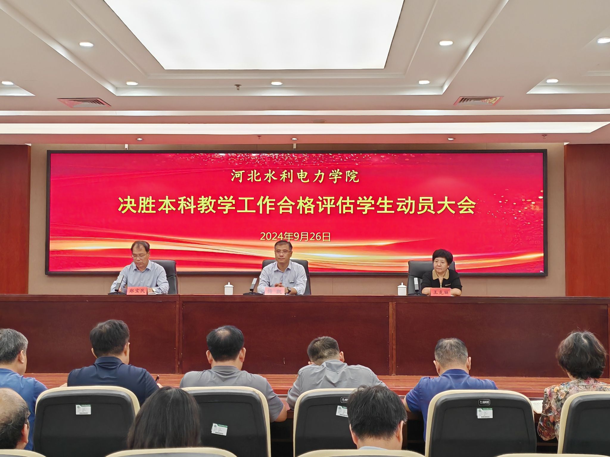 为进一步统一思想、凝心聚力、全力以赴迎接教育部本科教学工作合格评估,9月26日下午,我校在弘文守正楼学术报告厅召开决胜本科教学工作合格评估学生动员大会。本次会议采用主会场同步直播,分会场在线观看形式,各系领导班子成员、全体学工人员、各级学生组织全体成员、各班班长团支书及各宿舍宿舍长共2300余人参加会议。学校党委常委、副校长杨凯出席会议,会议由党委学生工作部部长、学生处处长郑宝民主持。大会现场会上,评建办主任王克丽对我校本科教学合格评估工作做了详细解读;...