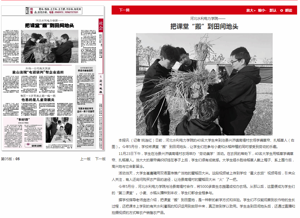 12月2日,《沧州晚报》报道我校以校办农场为平台,积极开展大学生劳动教育和“第二课堂”情况。我校南堤农场(简称“校办农场”)位于沧县兴济镇南堤村,于2024年5月挂牌成立。农场依托我校与沧县春润合作社的合作关系,充分利用当地现代农业示范园区内的蟹稻田、旱碱麦田、温室大棚、涵闸水渠等场地设施,规划了用于劳动教育、红色教育、实验实训、实践研学等功能区域,面向大学生开展具有水电特色的育人教育及科普活动,进一步丰富和拓展了我校“...