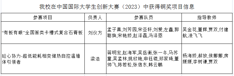 2024年1月25日在教育部司局函件《关于公示中国国际大学生创新大赛(2023)获奖名单及信息核对的通知》中,我校学子获得国家级铜奖两项,取得我校在此项赛事的重大突破。