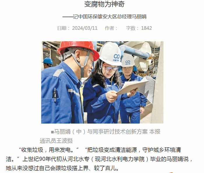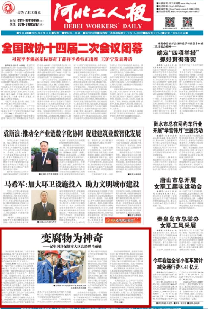 3月11日,《河北工人报》头版以“变腐物为神奇——记中国环保雄安大区总经理马丽娟”为题报道了我校杰出校友马丽娟的先进事迹。
