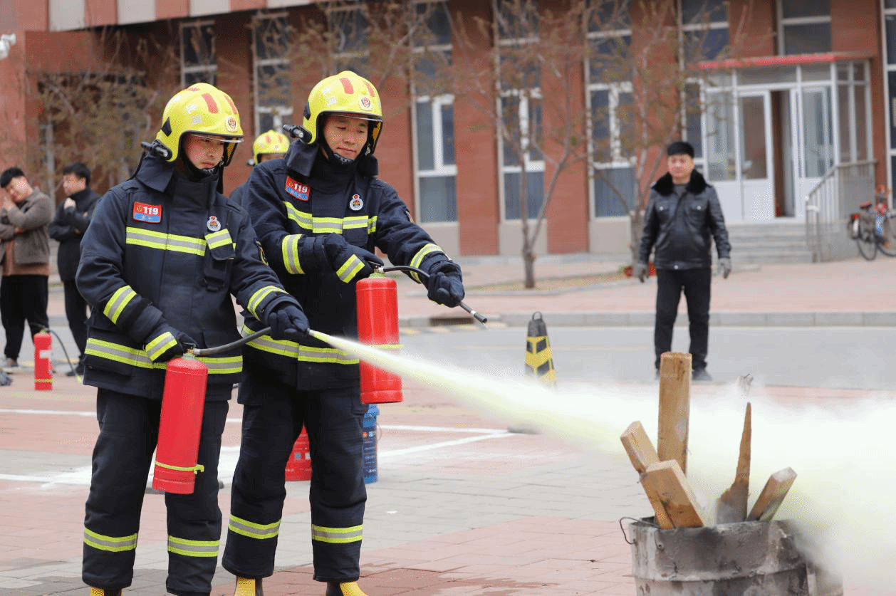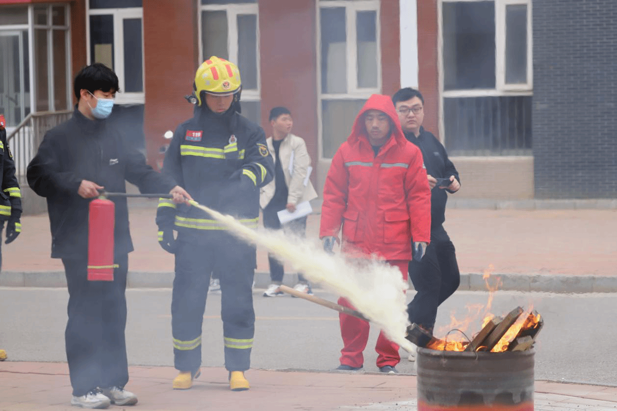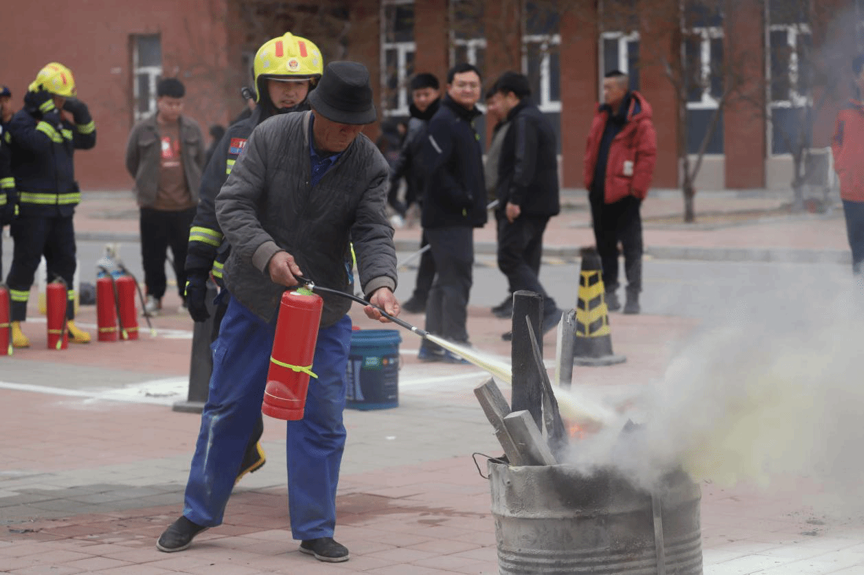 点评结束后,赵江奎和8名消防员通过解说和现场演示的方式为师生员工详细讲解了灭火原理、四种灭火方法、灭火器的种类和使用方法,随后,全体参演人员使用灭火器进行了灭火。