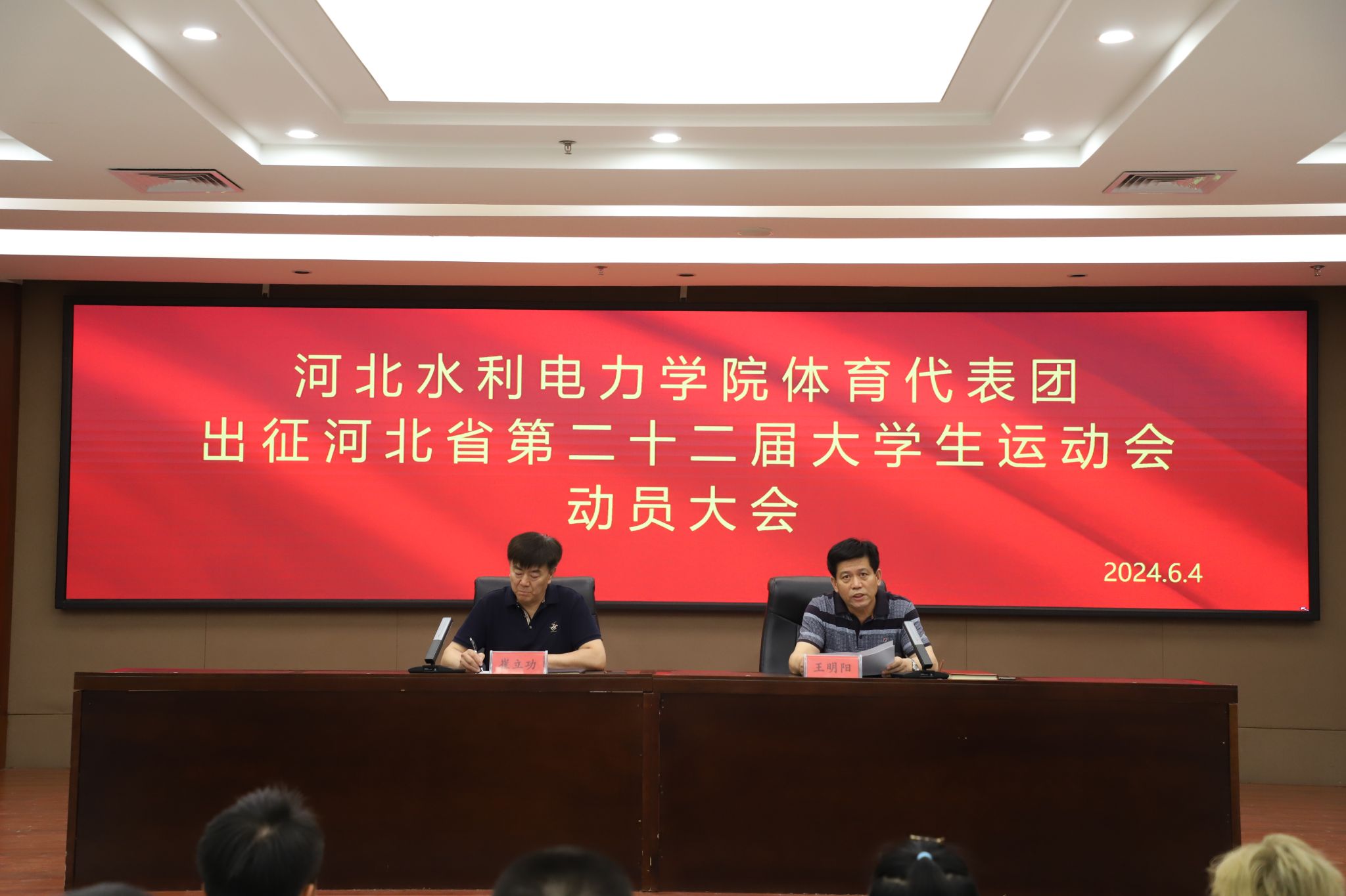 6月4日下午,我校体育代表团出征河北省第二十二届大学生运动会动员大会在弘文守正楼9楼报告厅举行,副校长崔立功及全体参赛教练员、运动员、工作人员及部分教师代表参加会议。体育教学部主任王明阳主持会议。
