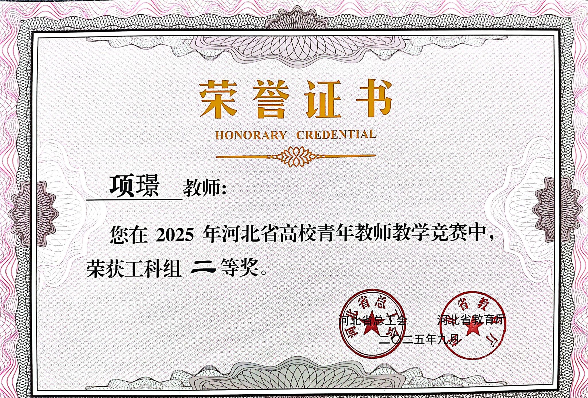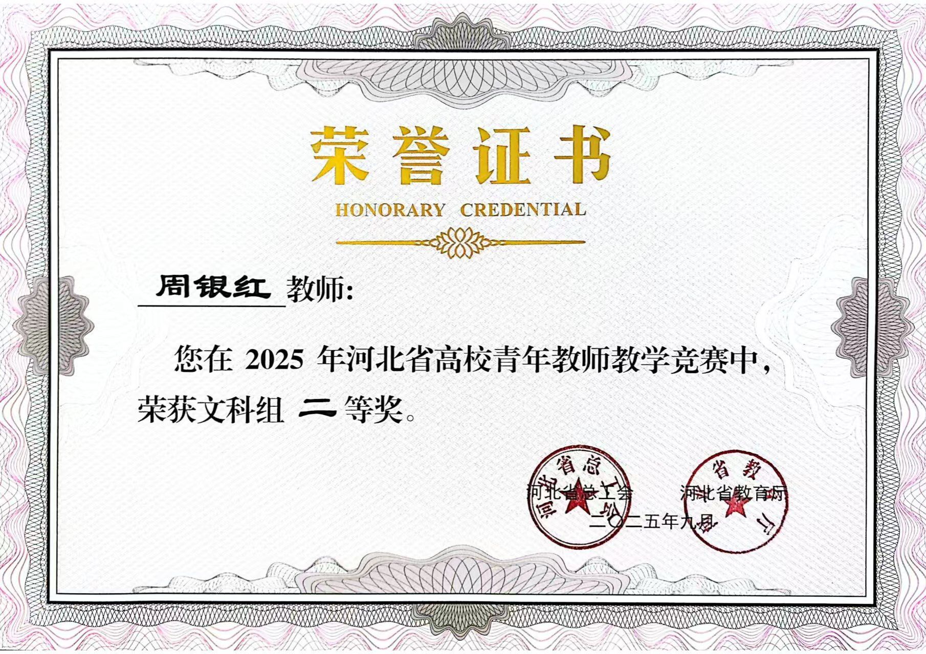 9月30日,河北省高校青年教师教学竞赛在石家庄职业技术学院圆满落下帷幕。我校经济贸易系周银红老师、电气自动化系项璟老师,分别在文科组、工科组双双斩获二等奖。这是我校首次在该省级权威赛事中实现文、工两个学科组别奖项的“双线突破”,充分展现了学校青年教师队伍的综合素养与教学实力。