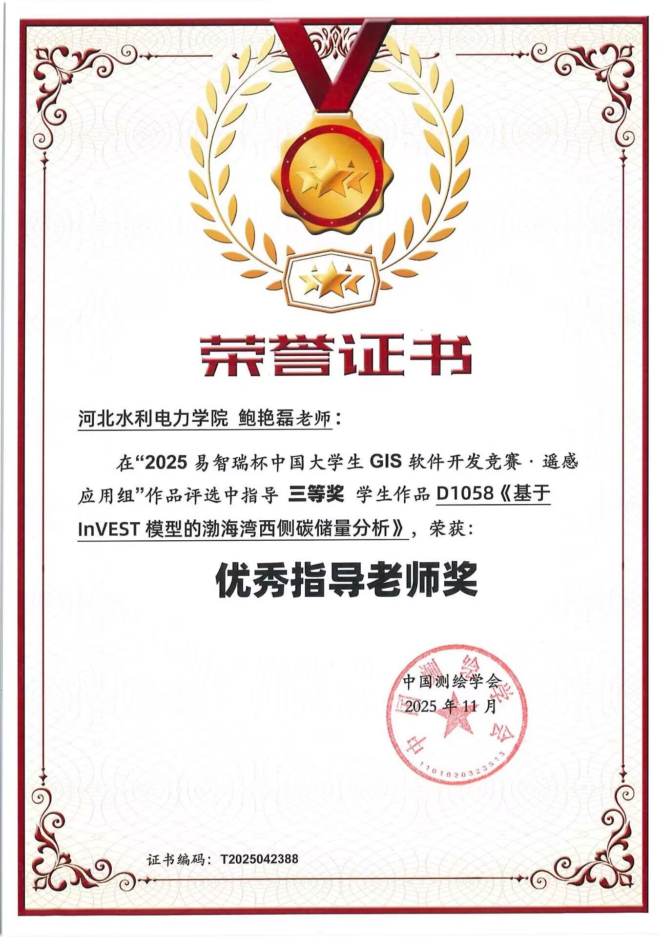 “易智瑞杯”中国大学生GIS软件开发竞赛由中国测绘学会主办、易智瑞信息技术有限公司承办,是国内GIS领域最具示范性、引导性和广泛性的学科竞赛之一。该竞赛旨在激发在校学生学习、应用和交流地理信息科学(GIS)技术的热情,增强学生的创新创造与动手实践能力。本届大赛吸引了吉林大学、兰州大学、中山大学、中国矿业大学等全国数百所高校、数千支参赛队伍,众多优秀学子参与角逐,竞争激烈。本次竞赛中,指导教师鲍艳磊全程指导学生选题、技术路线设计与成果打磨,在传授专业知识的同时引导学生服务地方、锤炼本领。