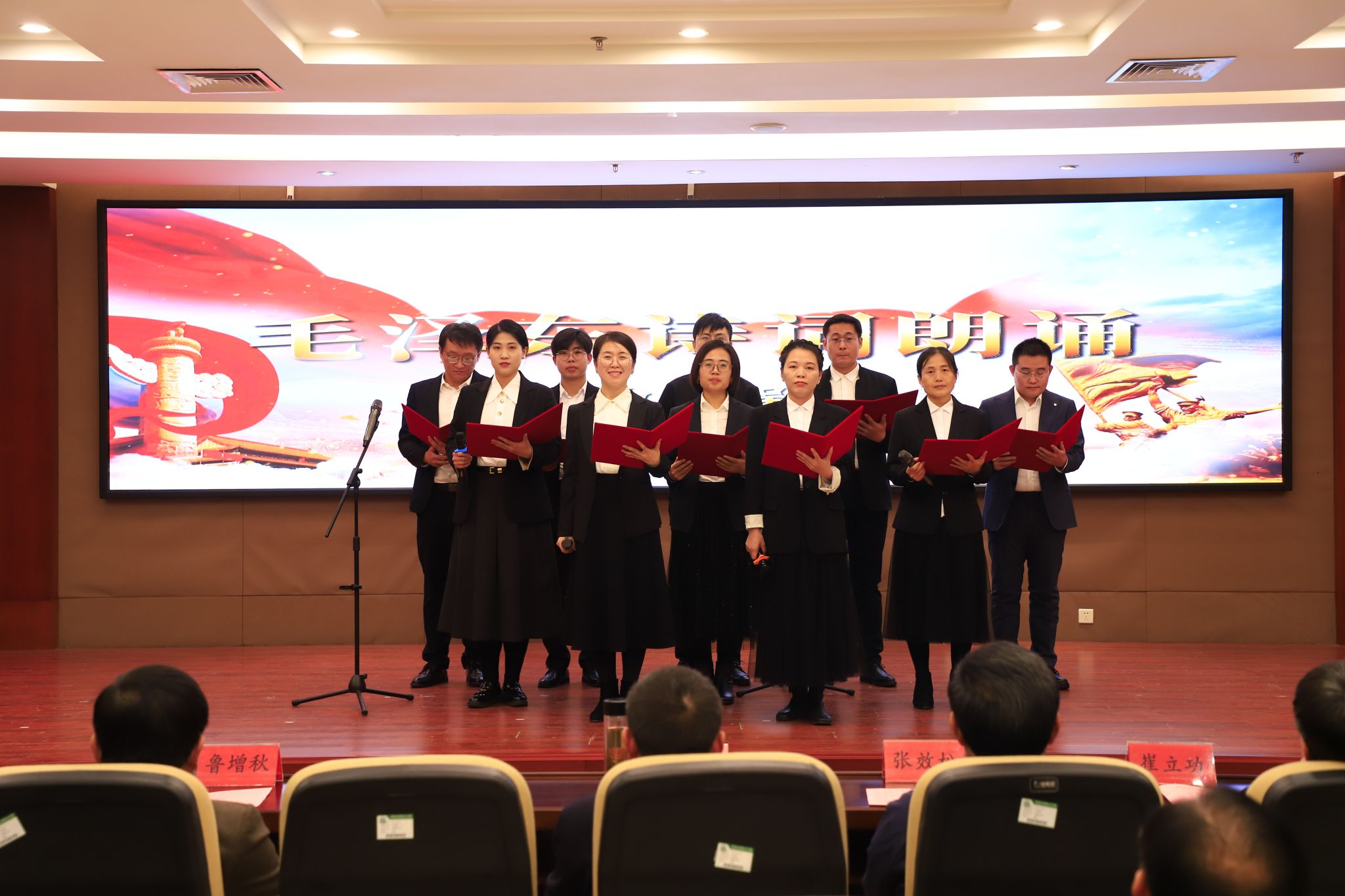 朗诵会聚焦毛泽东同志的经典诗词与著作,各分工会精心编排的节目依次登场,将文学经典与艺术形式融为一体。从《沁园春·雪》《七律·人民解放军占领南京》到《伟人诗魂照初心》,老师们或豪迈、或深情、或细腻的演绎,仿佛带领观众穿越时空,重温峥嵘岁月,感受伟人的胸怀与理想。学生合唱团激昂唱诵的《长征》将现场气氛推向高潮,让观众深刻感受到革命精神跨越时代的感染力。