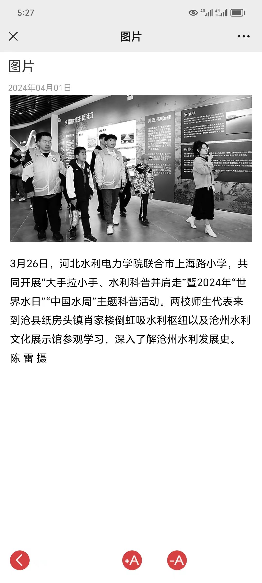 沧州日报4月1日第6版,报道了我校“大手拉小手、水利科普并肩走”暨2024年“世界水日”“中国水周”主题科普活动。