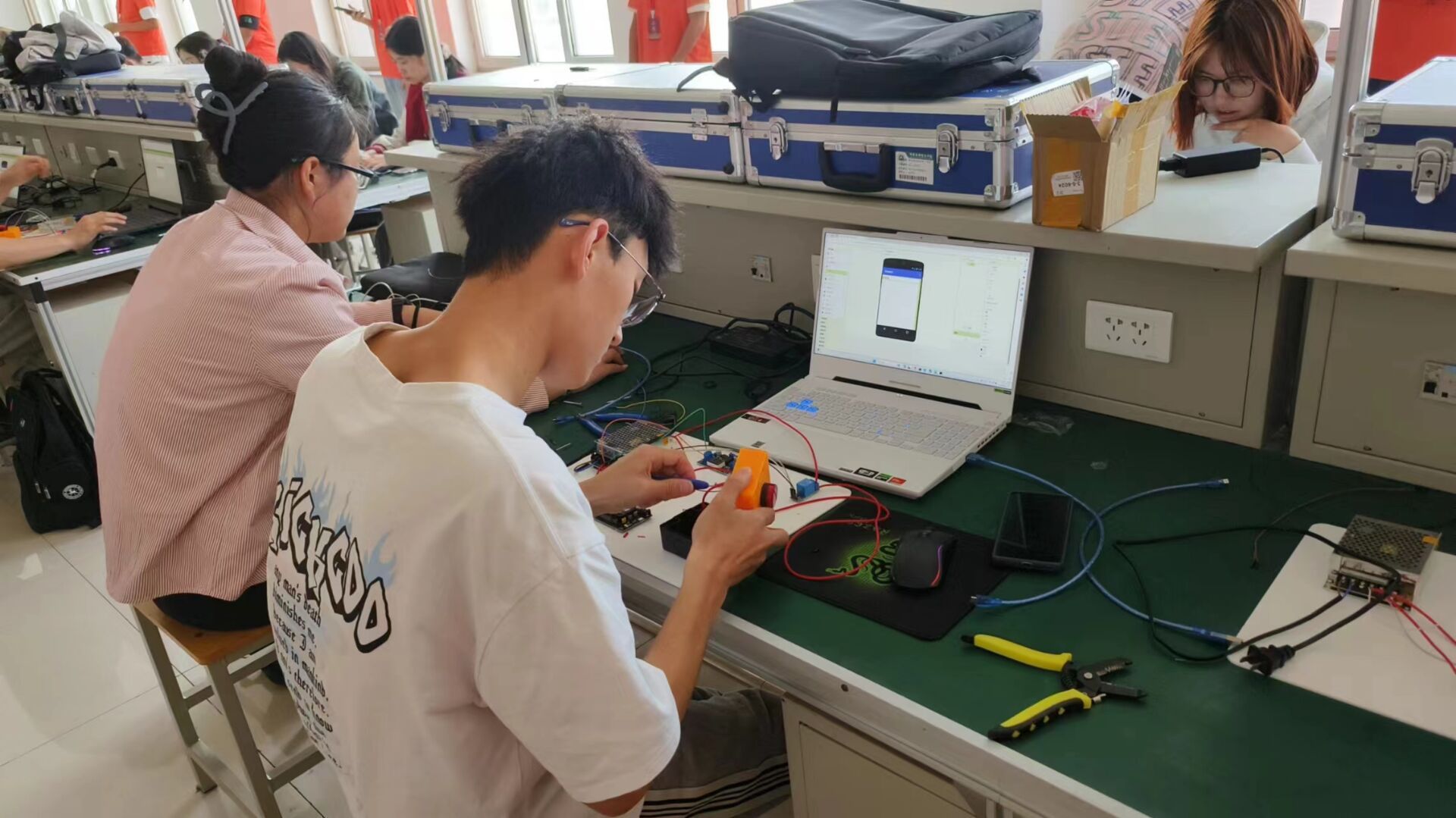 大赛经过初赛,选拔出33名选手进入决赛。本次决赛分为硬件安装和软件设计两部分,软硬件结合的方式也是本次比赛的创新之处。比赛过程中,参赛选手根据所给材料独立进行接线组装,全神贯注投入到各自的项目中。在软件设计环节,每位同学进行现场学习操作、现学现用,充分发挥自身创新学习能力。最后,老师与同学们就本次学习实践内容进行了深入交流讨论。通过本次比赛,同学们施展了才华、磨炼了技能,为更深入的学习打下了良好基础。
