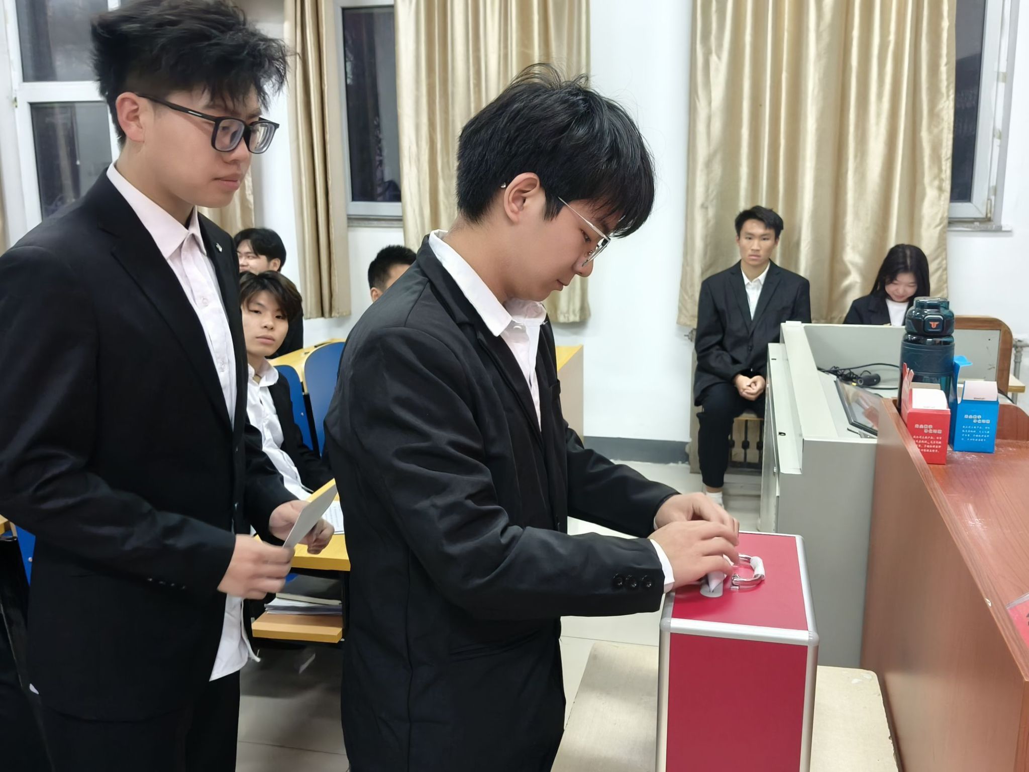 第二次全体代表大会中,杨铭轩同学宣读了大会选举办法(草案),全体代表审议并通过大会选举办法,通过监票人和计票人名单。大会工作人员介绍学生委员会委员候选人基本情况、学生会执行主席候选人基本情况。秉承公平、公正、民主的原则,学生代表进行投票。根据统计选票结果,大会主席团第二次会议听取选举结果的报告,通过当选名单。