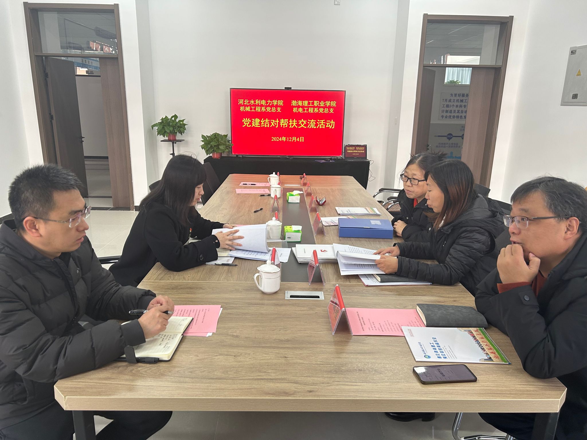 机械工程系党总支书记荆秀萍对渤海理工职业学院机电工程系党总支书记李文涛一行的到来表示热烈欢迎,并以“围绕中心抓党建,抓好党建促发展”为核心,从政治建设、思想建设、组织建设、制度建设、作风建设、党建工作与中心工作互融互促等方面分享了党建工作经验和做法。她指出,开展党建结对共建是贯彻落实习近平总书记关于党的建设的重要思想的具体举措,是构建“资源共享、优势互补、互相促进、共同提高”的党建工作新格局的积极探索。工作中要进一步在健全运行机制、发挥政治引领作用、提升师生思想政治工作质量方面加大力度,形成在认识上“同频共振”、资源上“互通共享”、经验上“互学互鉴”,真正实现“1+1>2”的合力效应。希望通过党建结对共建,双方在完善制度建设、夯实基层组织建设、创建党建特色品牌等方面都得到更好提升,切实将党的政治优势、组织优势转化为推动高质量发展的强大动力,共同为我省教育事业发展贡献智慧与力量。