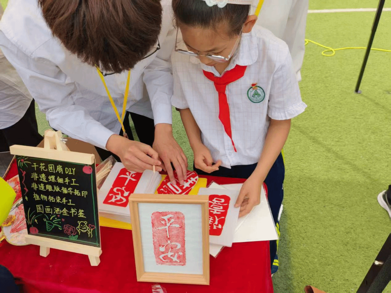 两小时的沉浸体验中,非遗技艺从书本文字转化为可触可感的实物:温热的拓片、流光溢彩的螺钿、草木染香的布袋、春意盎然的团扇,还有墨香犹存的书签。孩子们在动手实践中体悟匠心精神,真切领会了“劳动创造美”的深刻内涵。