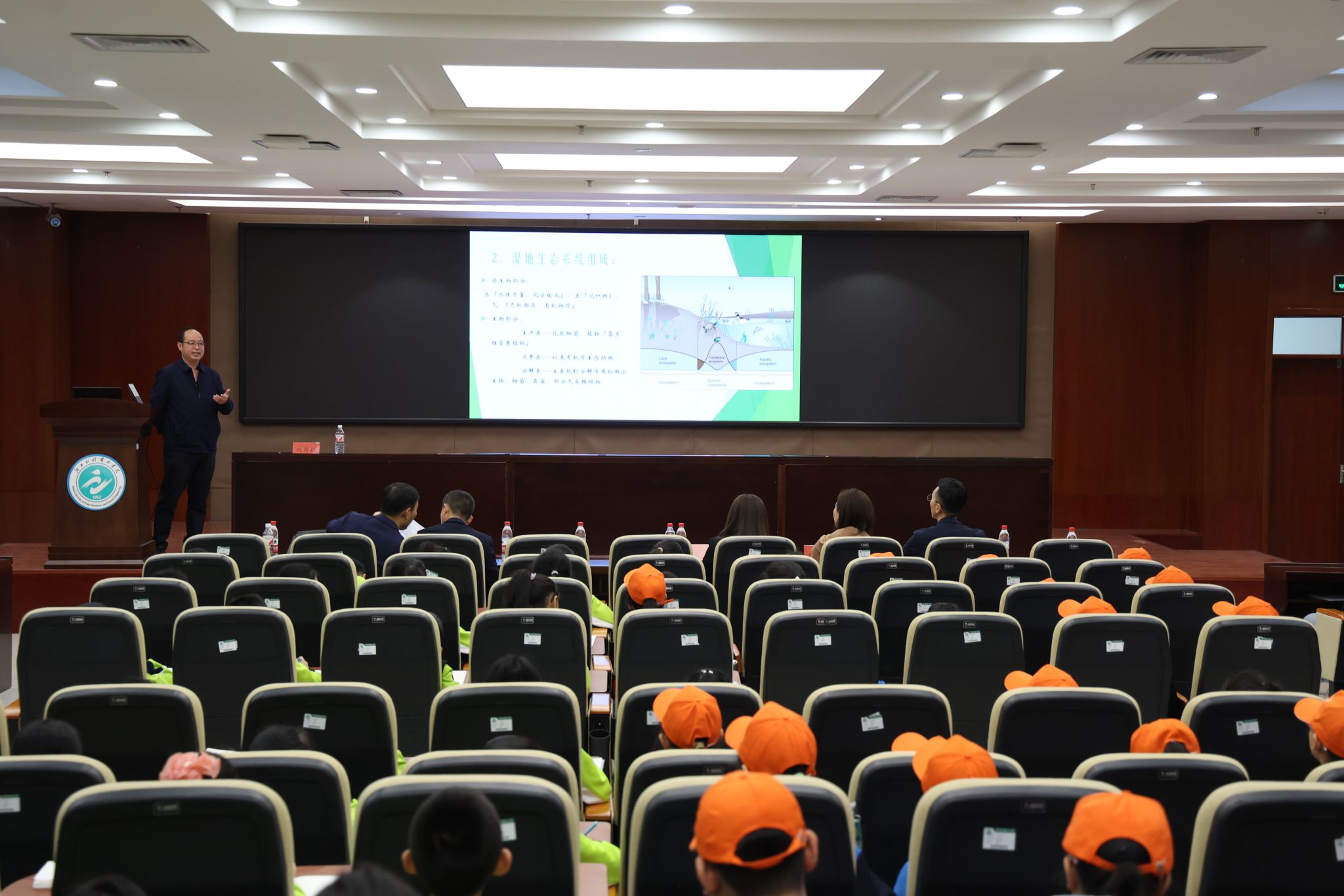 刘存歧教授作题为《探秘滨海湿地—守护蓝色生命线》的科普讲座,从湿地类型到碳汇机理,从生物多样性保护到气候调节效益,系统揭示了滨海湿地在维系海洋生态平衡中的关键作用以及对我国生态系统保护、生态文明建设的重要意义,用数据直观展现了保护滨海湿地的迫切性。刘教授的讲座深入浅出,生动活泼,同学们听得聚精会神,不时爆发出阵阵掌声。在交流环节,“大同学”和“小同学”积极提问,现场气氛轻松热烈。